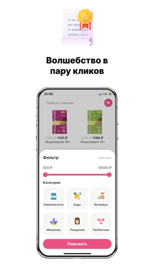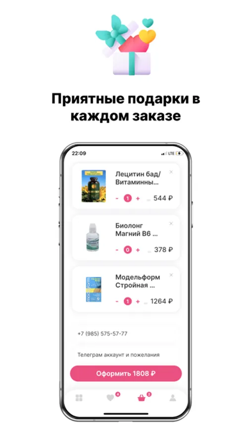 Для заказа можно воспользоваться фильтрами: витамины, бады, аминокислоты, минералы, для похудания, пробиотики. После выбора откроется лента товаров, которые необходимо добавить в корзину или в избранное, в результате нужно ввести свой номер телефона и оформить заказ. В личном профиле показана информация о личных заказах.