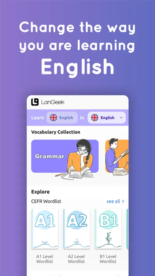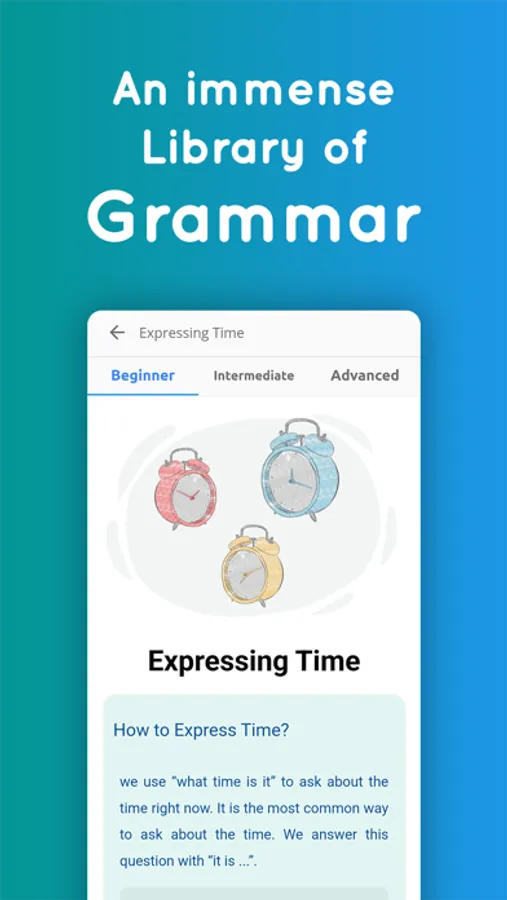 LanGeek app includes a thorough grammar library including all major and minor grammatical topics of English language.