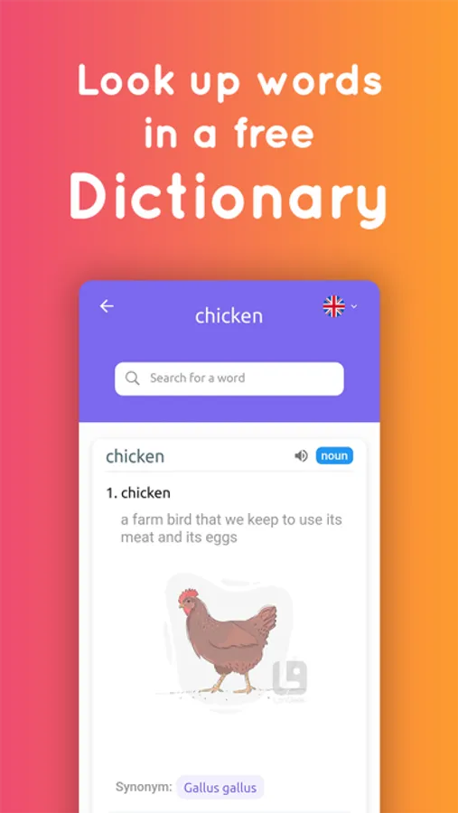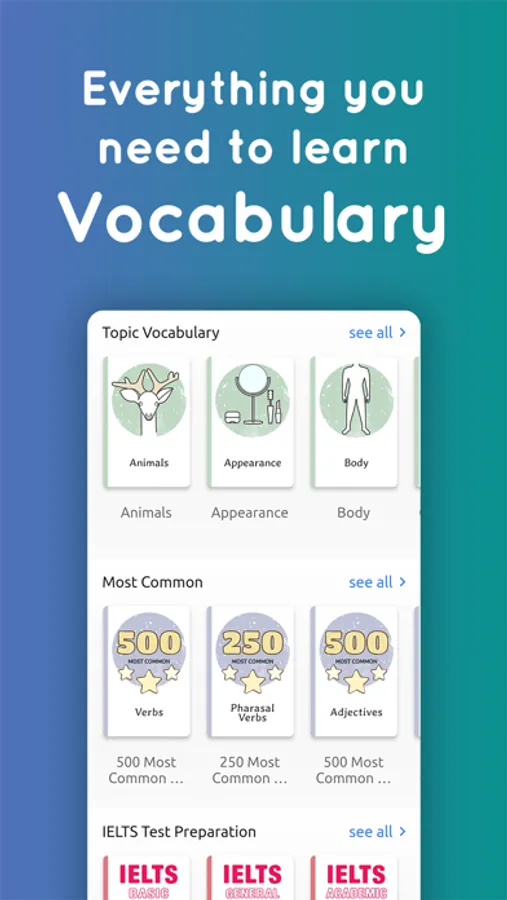 More than 20000 English words, categorized into different lessons based on their level or topic. Vocabulary lesson includes:
