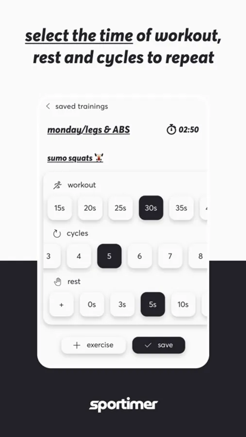 Select the duration of the workout, the duration of the rest between the workouts, and the workout cycles to repeat the exercise.