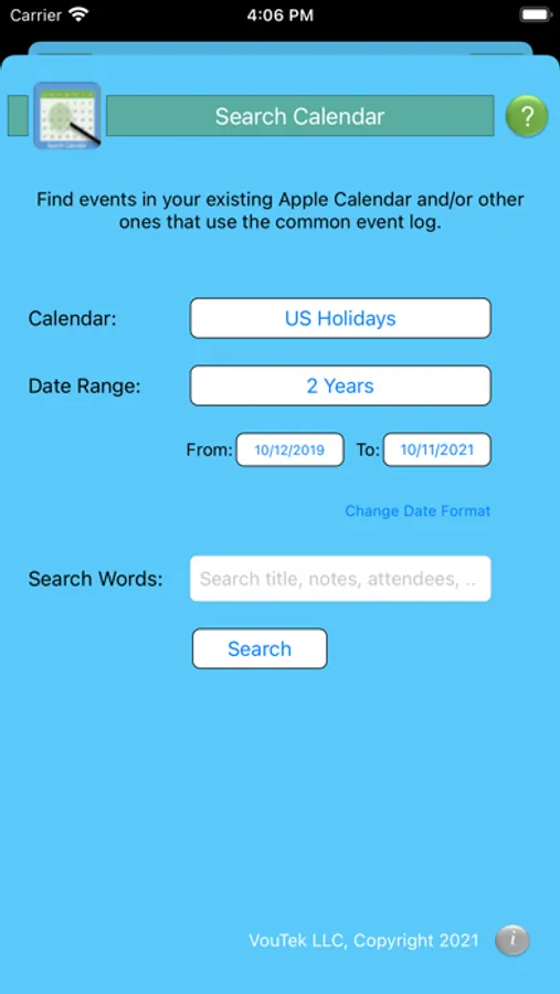 Search Calendar is an App used to make searching your existing iOS calendars easier than other Calendar Apps. Most calendars do not allow searching more than a year or two of data at one time. Search Calendar enables customizable searching your entire calendar at once. For example, if you wanted to search for all the meetings or appointments you have had on a specific subject over the past 10 years, you may do so in one query. You may search by key words in subject, location, invitees or other calendar fields. The App is Free. Currently Search Calendar is only available for iOS devices.