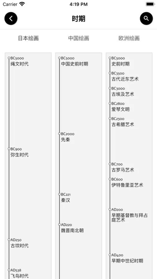 中国绘画:中国史前时期 - 先秦 - 秦汉 - 魏晋南北朝 - 隋唐 - 五代十国 - 北宋 - 南宋 - 辽金西夏 - 元代 - 明代 - 清代 - 民国时期 - 中国当代