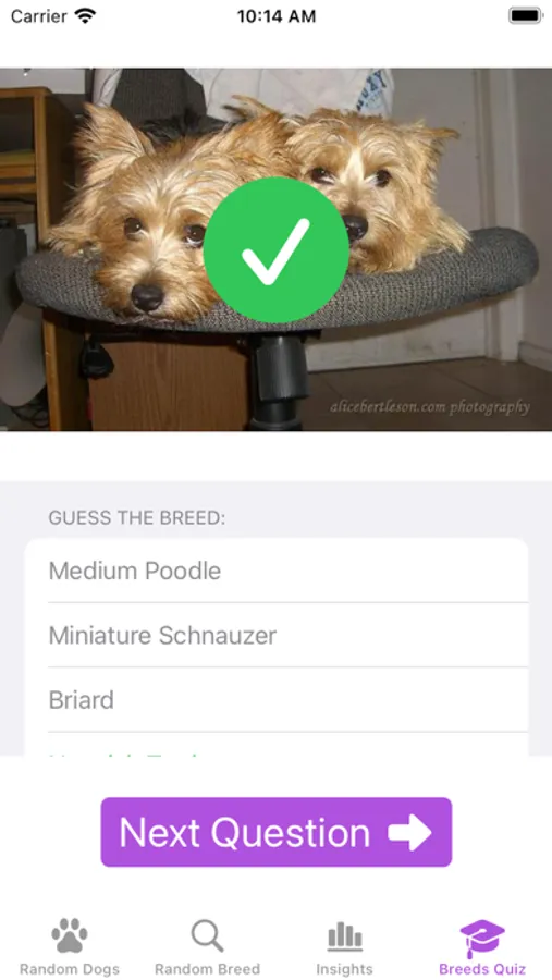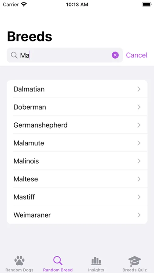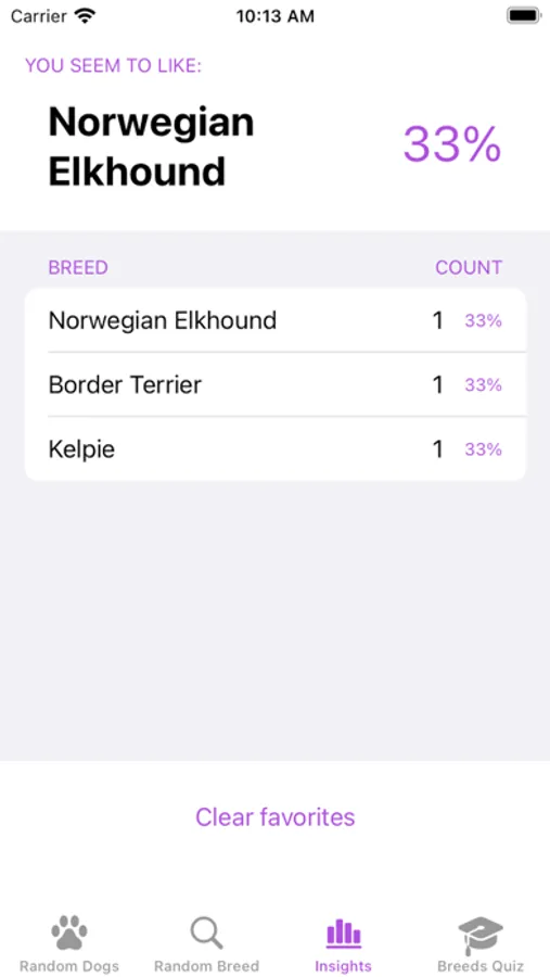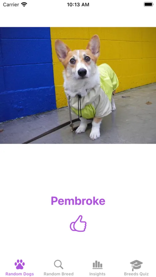 Random dog is an app that shows you random dogs. As you're browsing, you can't help but keep track of your favorites by hitting the like button. Insights shows a ranking of your favorite breeds. You can also Quiz yourself!