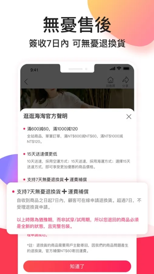 支持簽收後7天內無憂退換貨(此為猶豫期,非試穿期,所以退回商品必須是全新狀態且包裝完整喔);