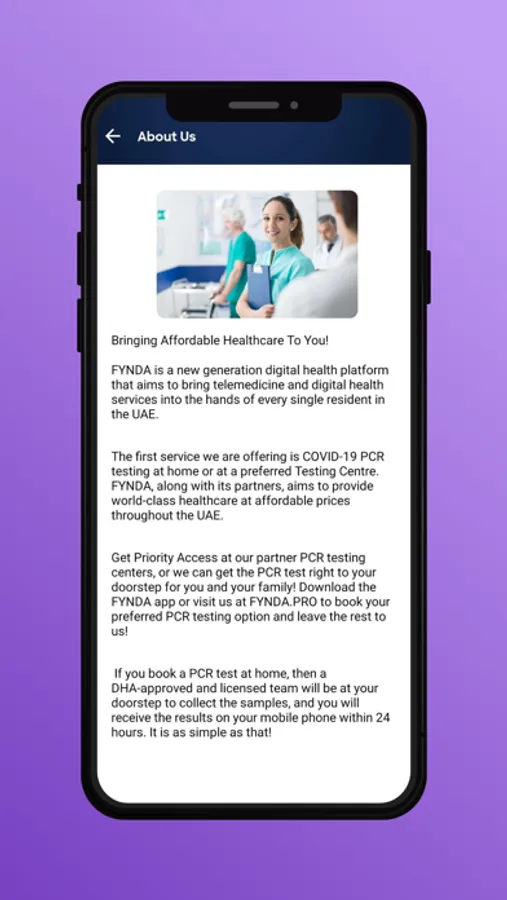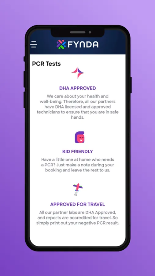 The first service we are offering is COVID-19 PCR testing at home or at a preferred Testing Centre. FYNDA, along with its partners, aims to provide world-class healthcare at affordable prices throughout the UAE.