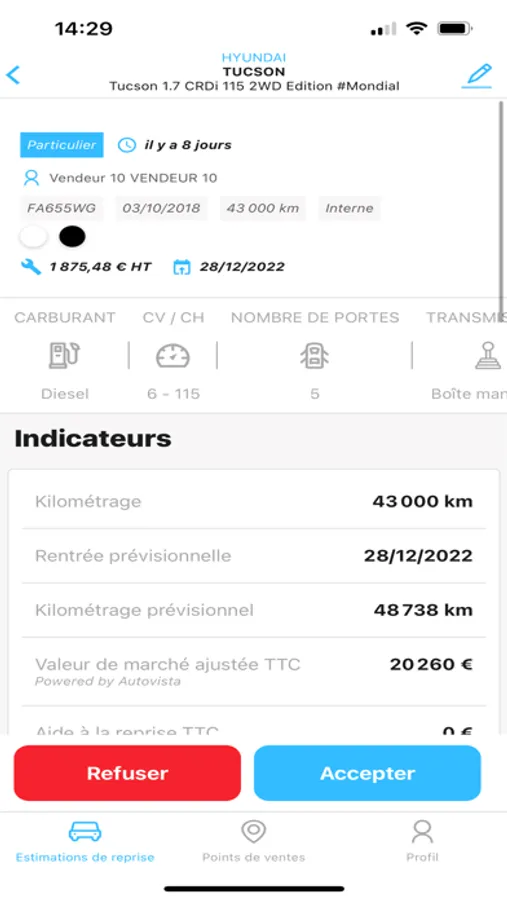 • Une vision détaillée de l’estimation de reprise comprenant les caractéristiques du véhicule, les indicateurs clés de l’estimation de reprise (prix de reprise, prix de revente, rotation moyenne, etc.) et autres informations complémentaires sur le véhicule, pour une appréciation détaillée de l’offre de reprise