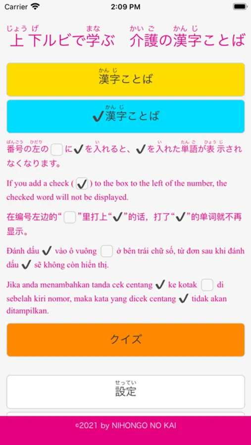 With this App, you can learn the kana readings given above and below the kanji words listed in the textbook “上下ルビで学ぶ 介護の漢字ことば”.