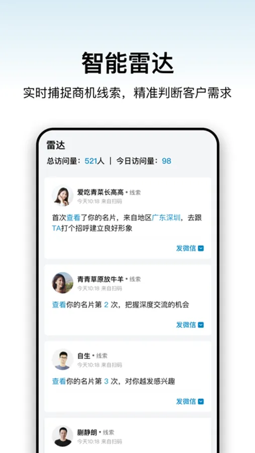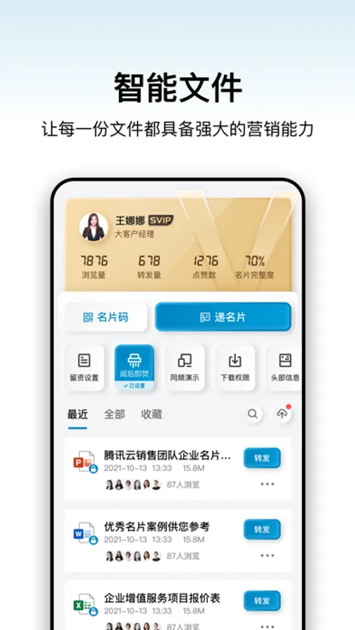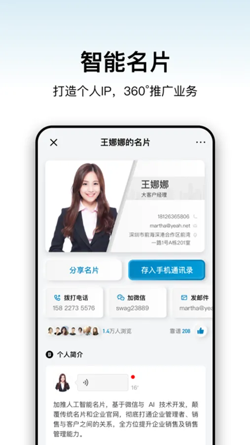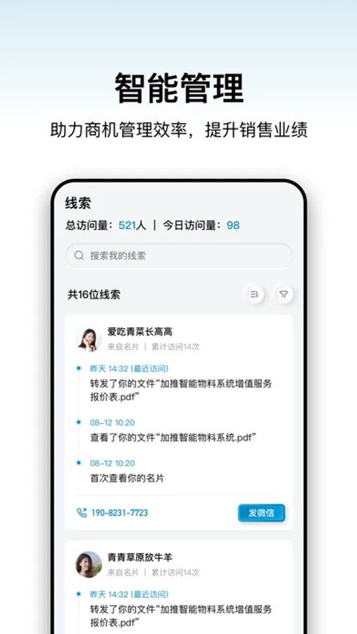 加推为每个商务人士量身打造的新一代智能商务工具,里面的所有销售资料都可以随时、随地分享给客户,并通过雷达实时反馈客户信息,智能分析客户意向,实实在在地帮你提升业绩。