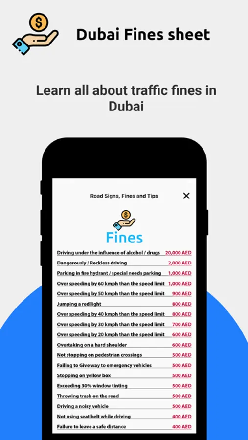 Moreover, the app also offers a list of Dubai traffic fines, and a set of tips to help you prepare for the test mentally so you can take it in your best shape.