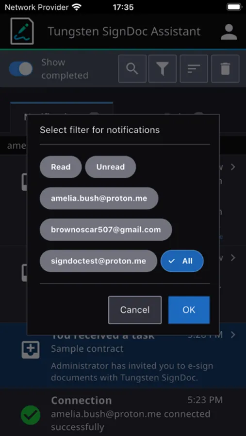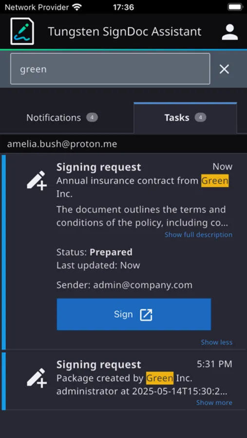 Tungsten SignDoc Assistant allows you to easily keep track of all of your Tungsten SignDoc signing or document review tasks in one convenient place. Receive push notifications whenever documents need to be signed or reviewed by you. You can also initiate the signing process from within the app and SignDoc will guide you through the simple signing process in order to complete your task.