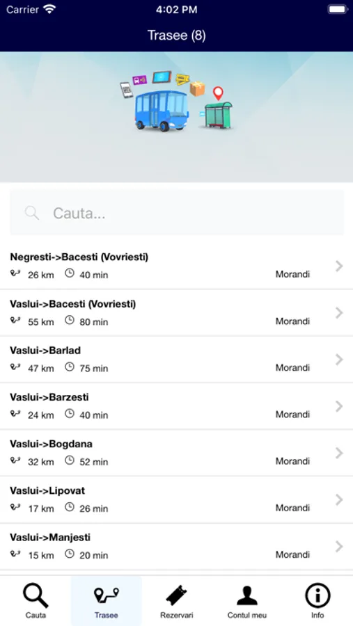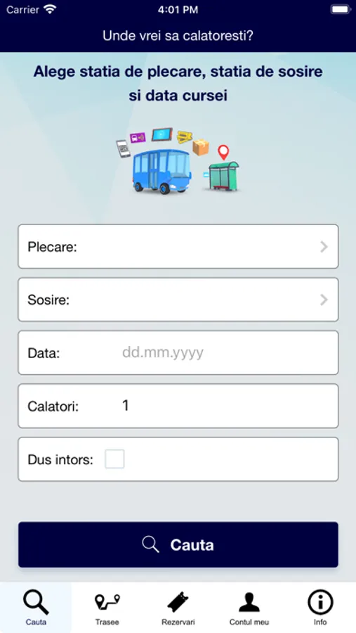 Aplicatie mobila pentru trasportul judeten si interjudetean de persoane destinata calatorilor care permite acestora sa se informeze cu privire la curse, orarele de circulatie si preturi pe anumite relatii, sa faca rezervari si plati online, sa ofere calificative curselor, sa fie informati in legatura cu locatia in care se afla mijlocul de transport si sa primeasca informatii cu privirea la anumite evenimente.