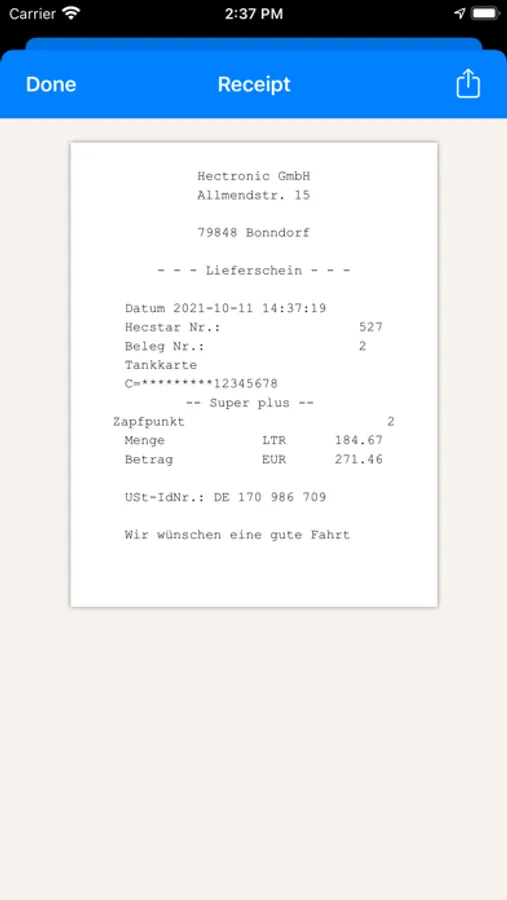 Zugriff auf den Transaktionsverlauf, in dem der Benutzer seine Belege im digitalen Format einsehen und die Möglichkeit hat, diese per E-Mail zu versenden.