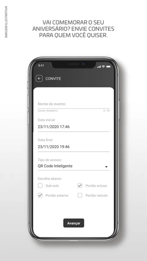 Possibilidade de o morador criar um evento e enviar convites para todos os seus convidados. Sempre que um dos seus convidado entrar ao condomínio, ele recebe uma notificação push no app.