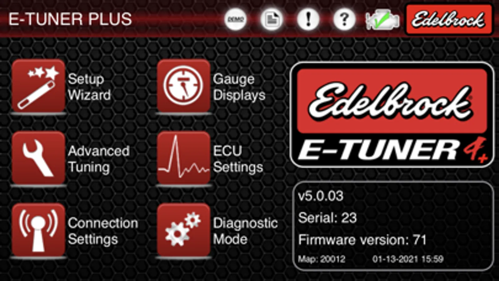 You can also preview E-Tuner 4 Plus without being connected to an Edelbrock EFI System by enabling "Demo Mode." This will allow you to access the app's main features, and interact with pages like the Setup Wizard, Advanced Tuning, and Gauge Displays to get a feel for how E-Tuner 4 Plus functions.