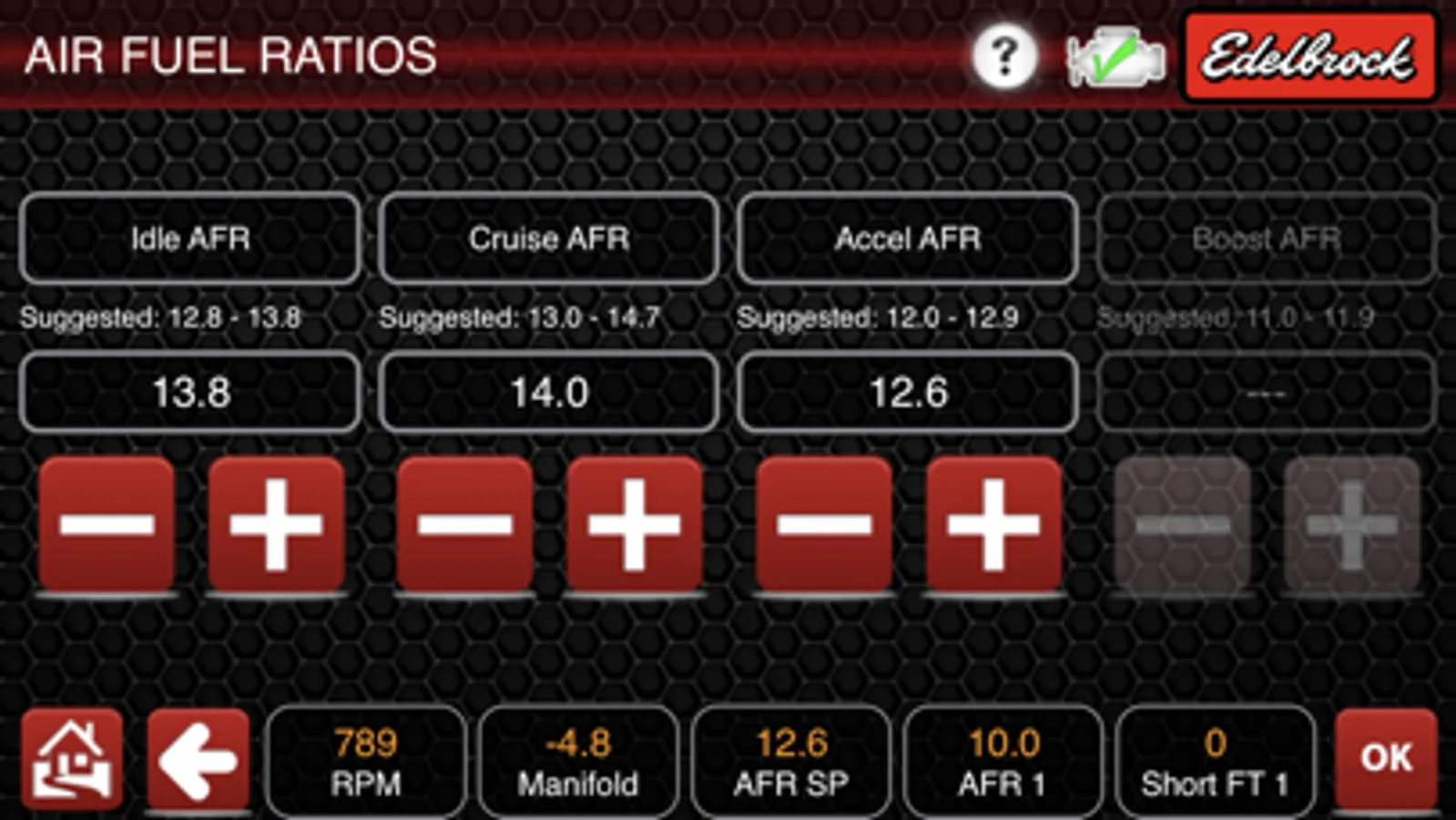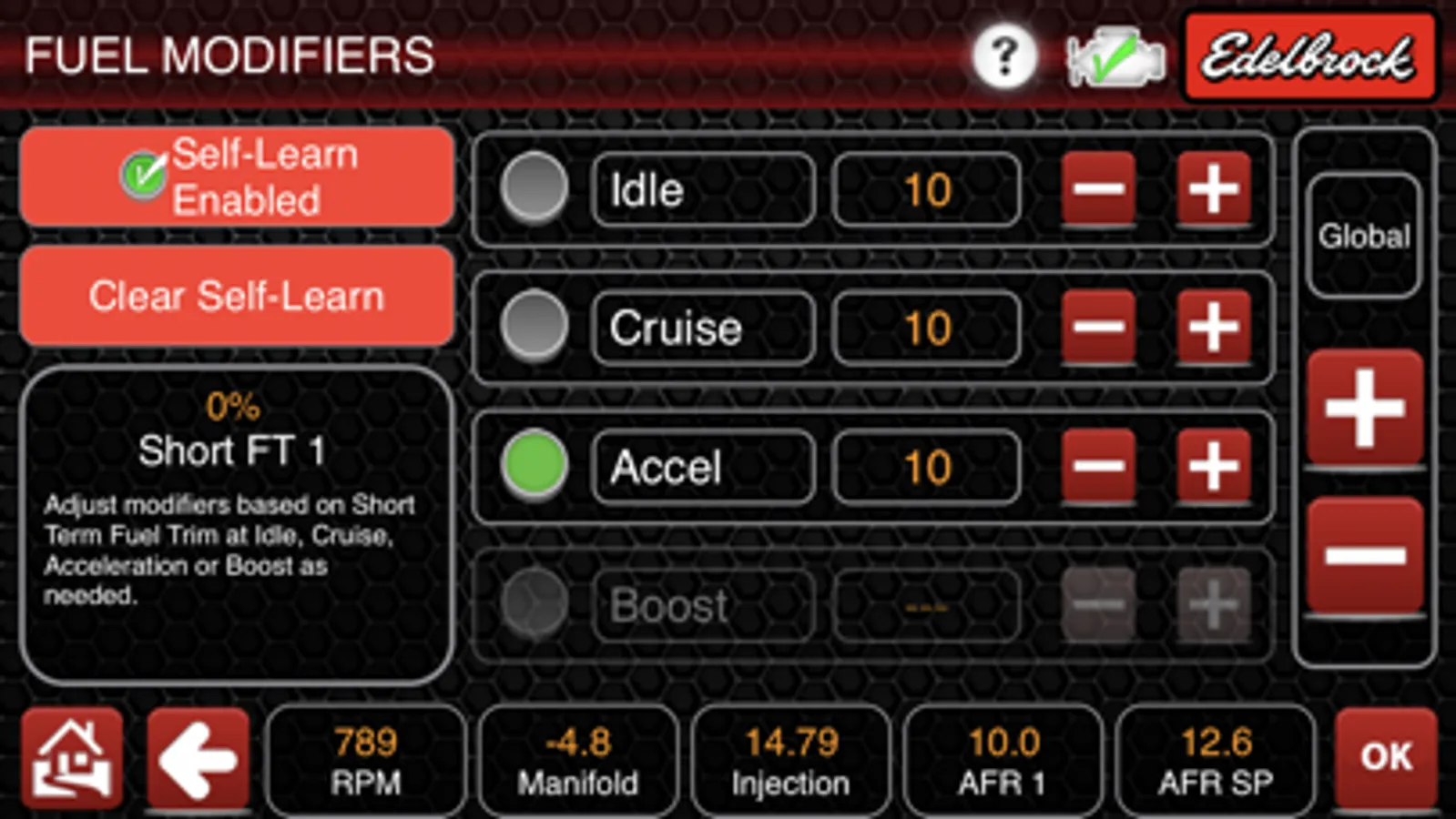 • User-adjustable fueling modifiers for idle, cruise and acceleration (WOT)
