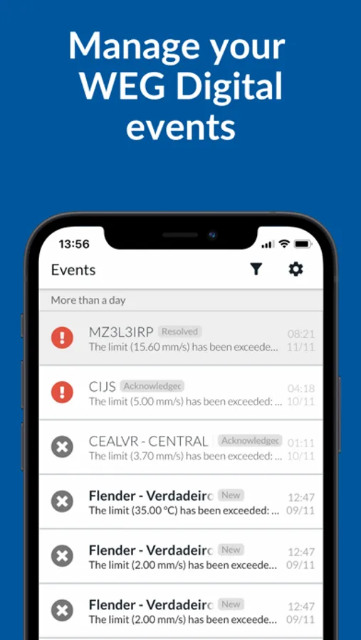 With the new WEG Digital Notify, you can better manage your events from WEG Digital monitoring applications (MFM, TFM, WSM) by receiving notifications as soon as the events are created.