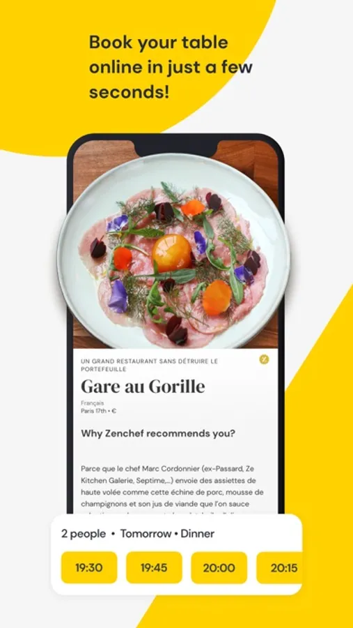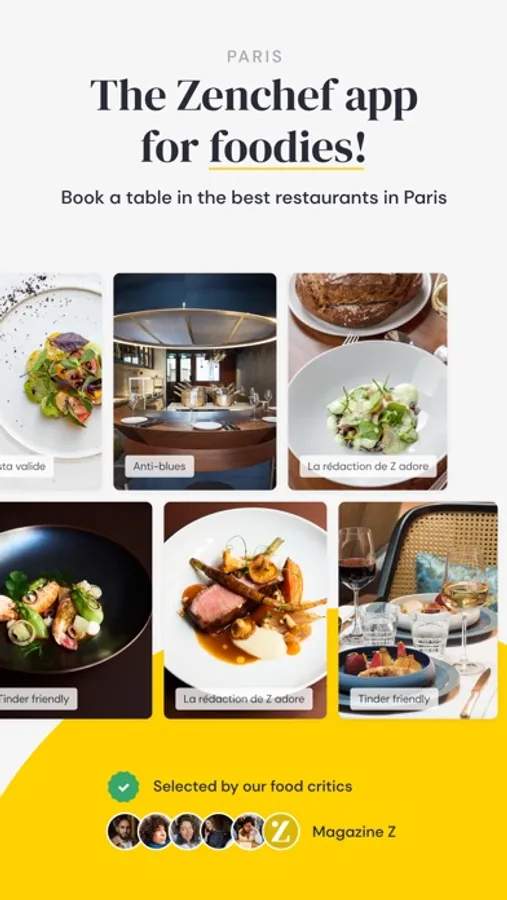 The Zenchef app for foodies!Book one of the 1,500 tables available near you in Paris on the Zenchef app. With a wide array of cuisines, atmosphere and experiences – from canteens, bistros and world cuisine, to dishes perfect for sharing, semi-gourmet or fine dining – you’re bound to find what you’re looking for.The perfect restaurant is just a click away: 1. Find THE restaurant that fits the bill. 2. Follow the in-depth advice of our culinary experts and food critics who passionately dine out year-round to select the very best restaurants. Let yourself be guided by their top picks and new finds.3. Reserve your table directly on the app, leveraging Zenchef’s technology and privileged relationship with the restaurant owners that we assist with booking management and customer welcome. In just one click, your booking is made directly on the Zenchef app in line with real-time availability. It’s quick and easy. Finding the right restaurant is so simple: - Effortlessly pick a restaurant for any occasion among the Parisian addresses listed and tested. Whether you fancy a neighbourhood bistro, a Michelin-starred restaurant, a local canteen, a wine bar or the latest place to be, our database is regularly expanded and updated. Reserving a restaurant has never been so easy!- Geolocate restaurants around you and see at a glance what’s available and what’s not to be missed. - Filter your choice depending on what you’re looking for: dinner with friends, anti-blues, Tinder-friendly, kids-friendly, menu, number of diners, and many more…- And then book your table online in just a few seconds!