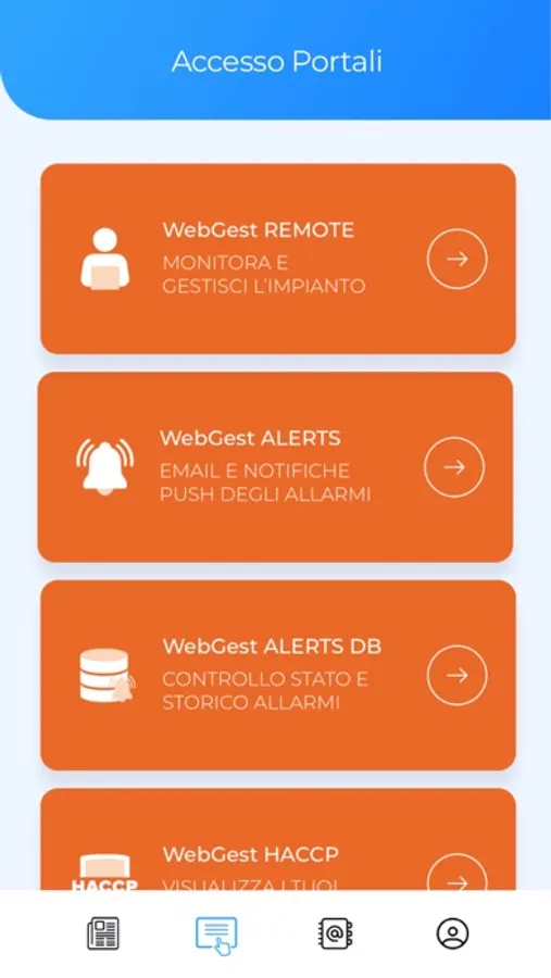 Avrai la possibilità di visualizzare e gestire: impianti, allarmi, HACCP, servizi attivi, news ed aggiornamenti.