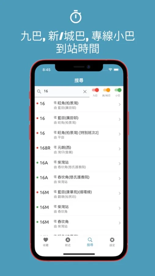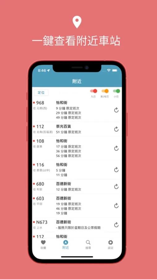 【到站時間】 整合了九巴、城巴、專綠小巴到站時間,讓你方便查看各類巴士到站時間。