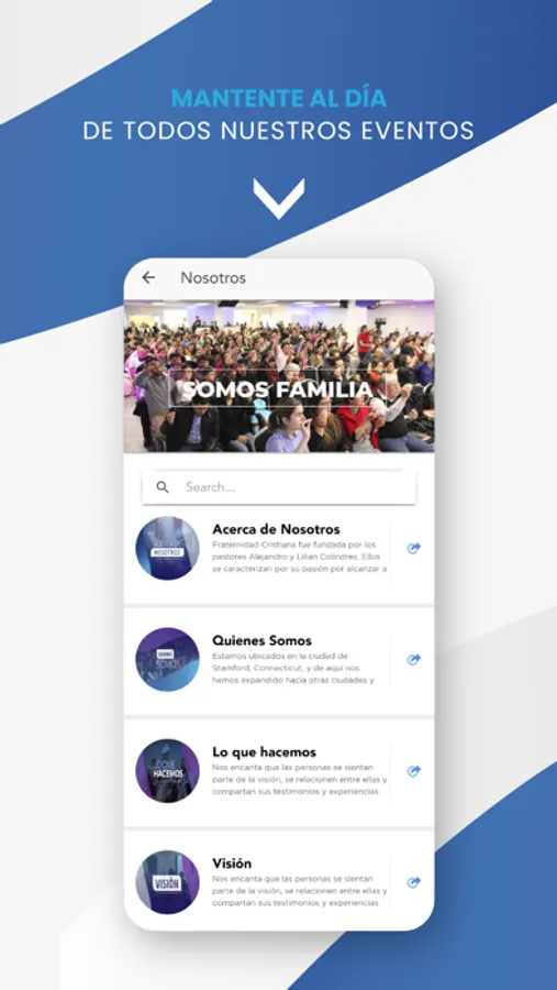 Accede a la aplicación móvil de Fraternidad Cristiana. Conéctate con ellos vía mobile e internet. Recibe las últimas prédicas, fotos, eventos y noticias de tu iglesia — en cualquier momento y cualquier lugar.