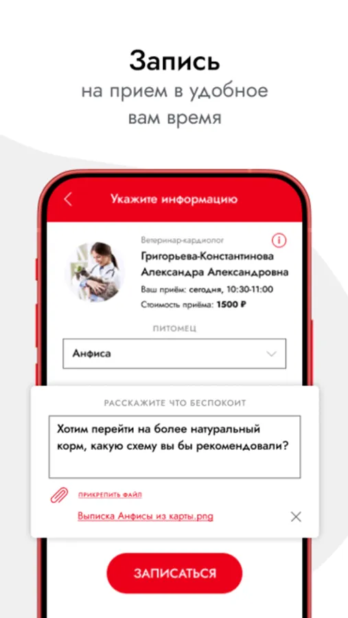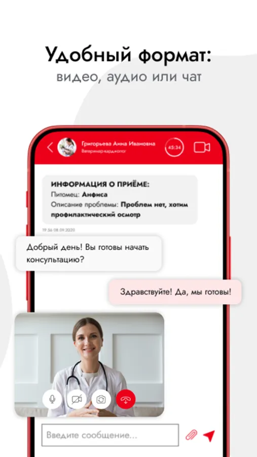 Получайте и проводите консультации онлайн: в формате видео, аудио или чате. Воспользуйтесь удобной и быстрой связью между врачом и владельцем питомца.