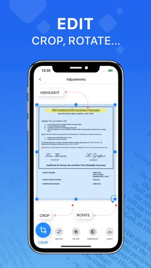 - EDIT scans perspective and borders, apply filters, adjust contrast, correct or change the orientation.