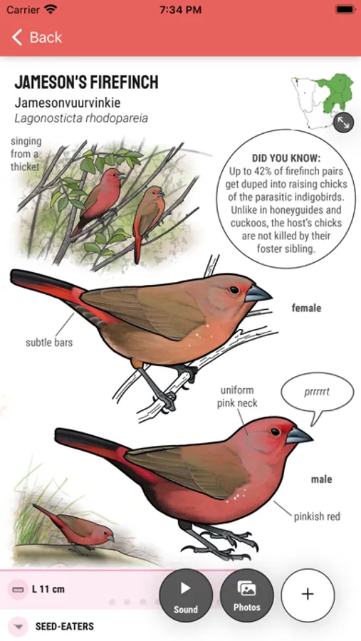 Firefinch is a beautifully designed, fun and easy-to-use birding app that will ignite an appreciation of birds and a celebration of the wild landscapes of Southern Africa. Explore illustrations, photos, sounds, maps, seasonal stats and helpful tips for almost 1000 bird species. And stay up to date with regular articles by expert birders, birding hotspot write-ups and info on the latest sightings and birding events. Join author and artist Faansie Peacock and the Firefinch community and embark on your birding adventure...whether you’re a fledgling or top twitcher.