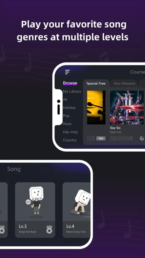 - It facilitates a progressive learning journey from mastering a single note to playing a beat, and from performing a beat to a complete song.