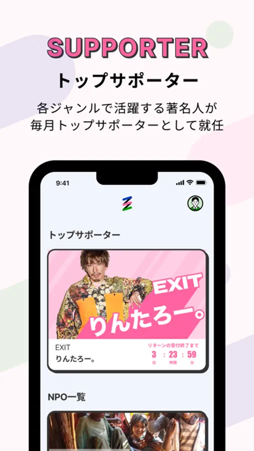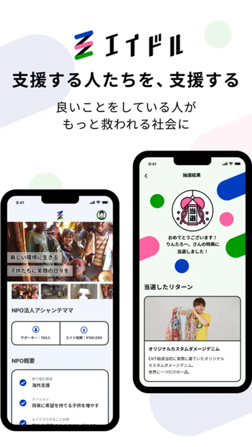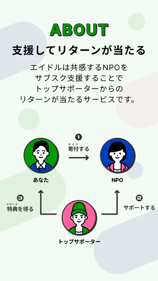 エイドルは共感するNPOに エイド(支援)ができるアプリです。エイドをしたサポーターは、トップサポーターから特別な特典を得られるチャンスがあります。