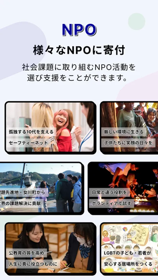 トップサポーターが共感するNPO、または あなたが感じている世の中の課題にチャレンジするNPO、いずれかを選んでエイド(支援)をしましょう。あなたの支援がよりよい世の中を作ります。