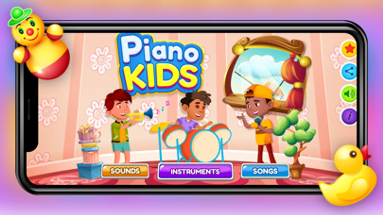 Play piano games for Children! Come sing along with your favorite music games for Children's! In piano games for Children, you may play interesting new musical instruments with your Children's piano learning buddies! These fantastic tunes and melodies will aid them in developing fantastic piano abilities in children's music games!
