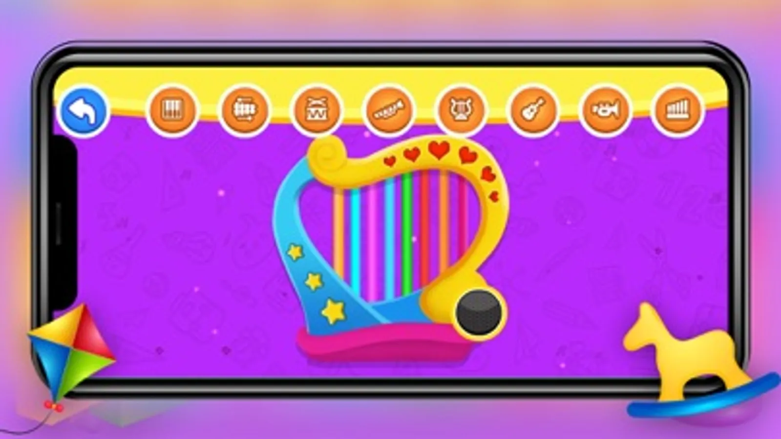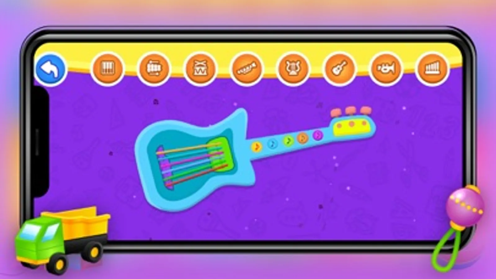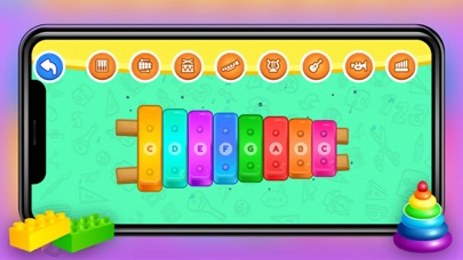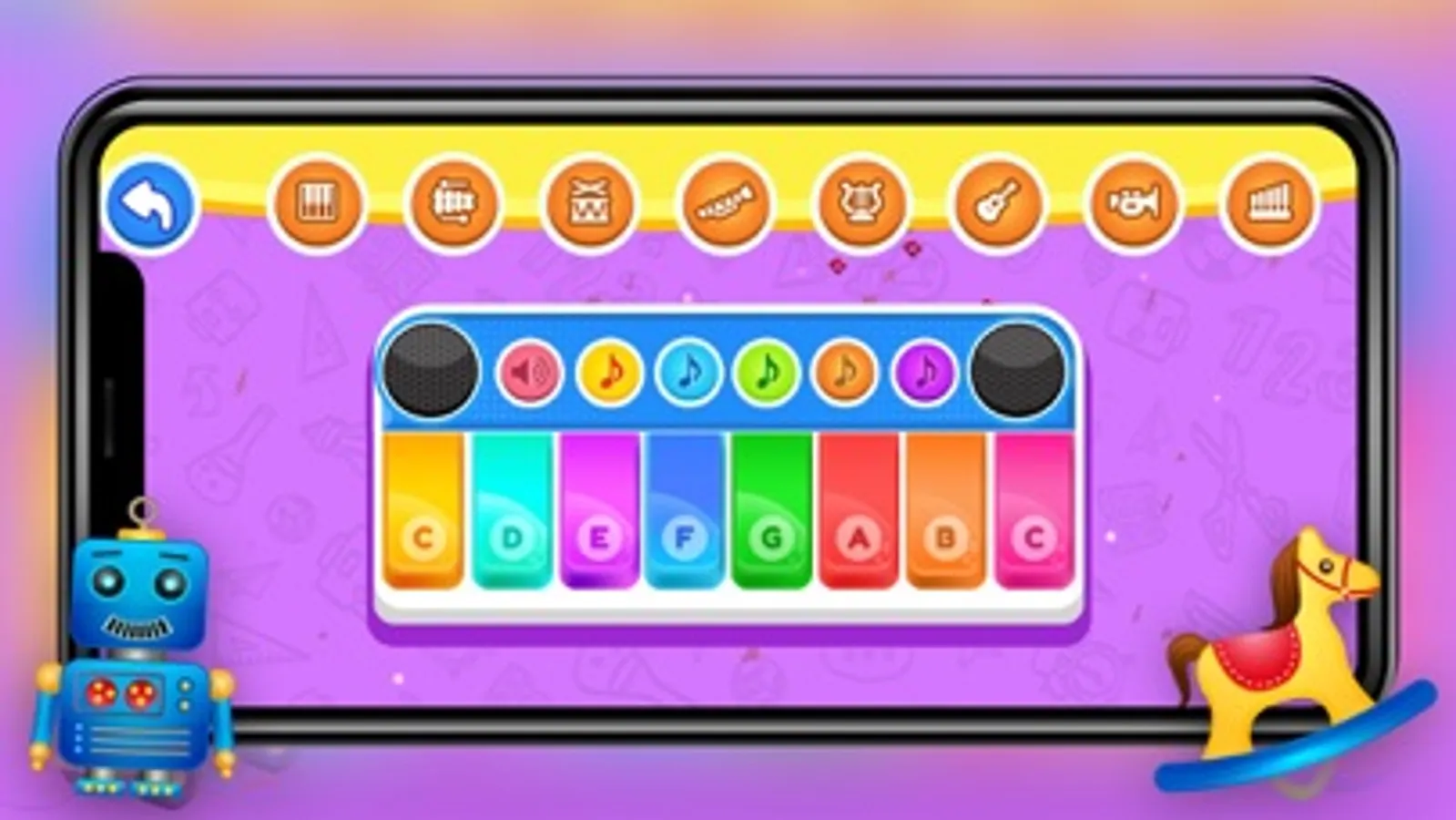 Children’s can learn to play amazing tunes. The song is played in "Auto Play" mode to help you learn the melody. Then you may play it on your own with the help. The music is accompanied by amusing figures who teach the child which note to play. You have the option of playing songs on the following instruments: Flute, piano, xylophone, guitar.