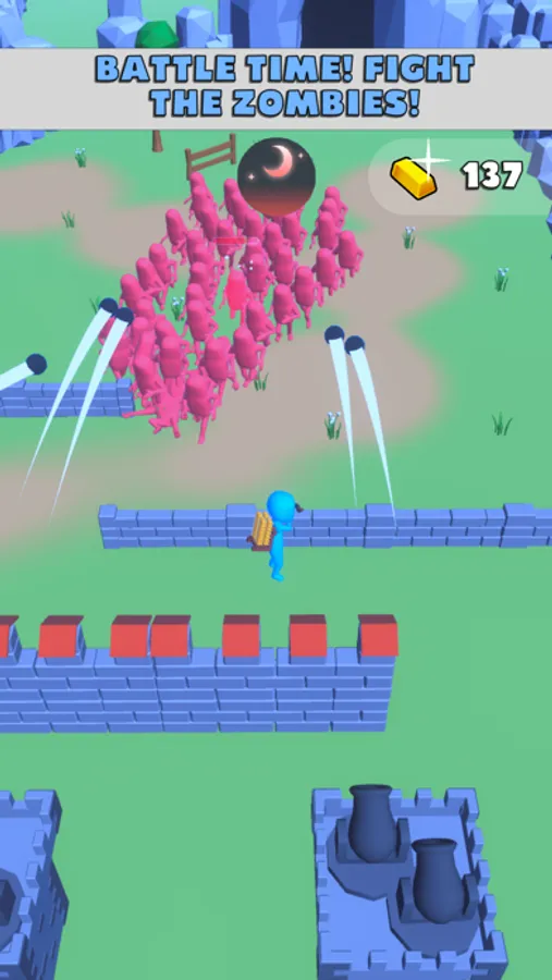 At night you will be attacked by zombies, so climb into the fortress and shoot back!