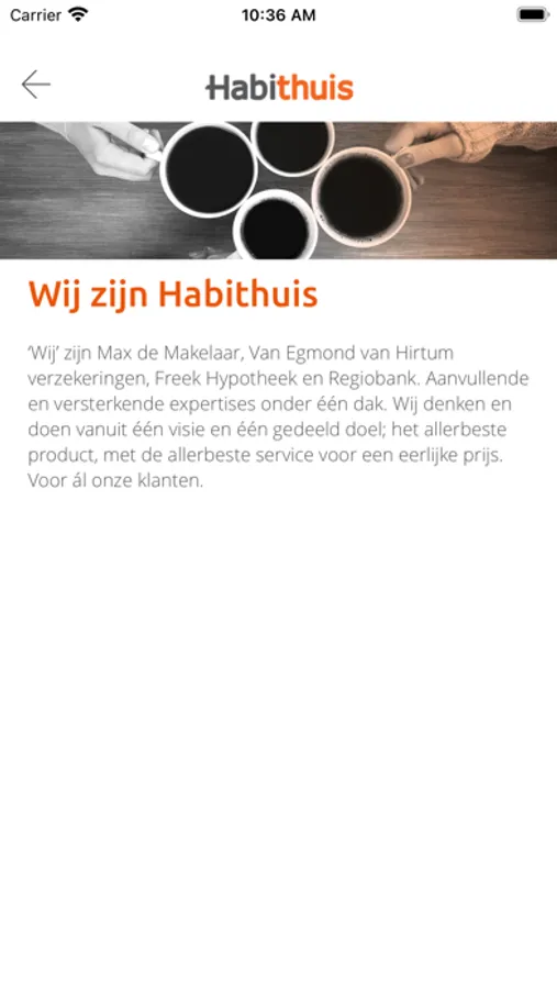 Bij Habithuis geloven we dat onafhankelijk en deskundig advies over wonen, geldzaken en verzekeringen onze klanten helpt om zorgenvrij te kunnen leven. Zo kunnen zij zelf invulling geven aan hun eigen unieke ‘Ruimte om te Leven’. Zorgeloos en met het volste vertrouwen dat zaken goed geregeld zijn én blijven. Dankzij onze app kunt u gemakkelijk in contact komen met onze diverse adviseurs. Daarnaast kunt u gemakkelijk stukken ter documentatie sturen zodat wij u nog beter van dienst kunnen zijn.