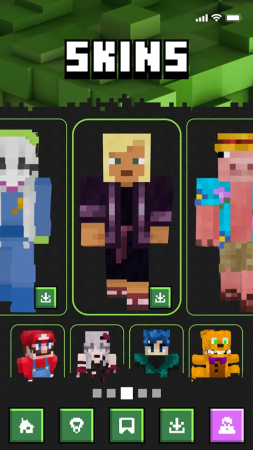 Skins for Minecraft PE will turn your character into a famous superhero, celebrity or movie hero! A huge number of shapes are available for you.