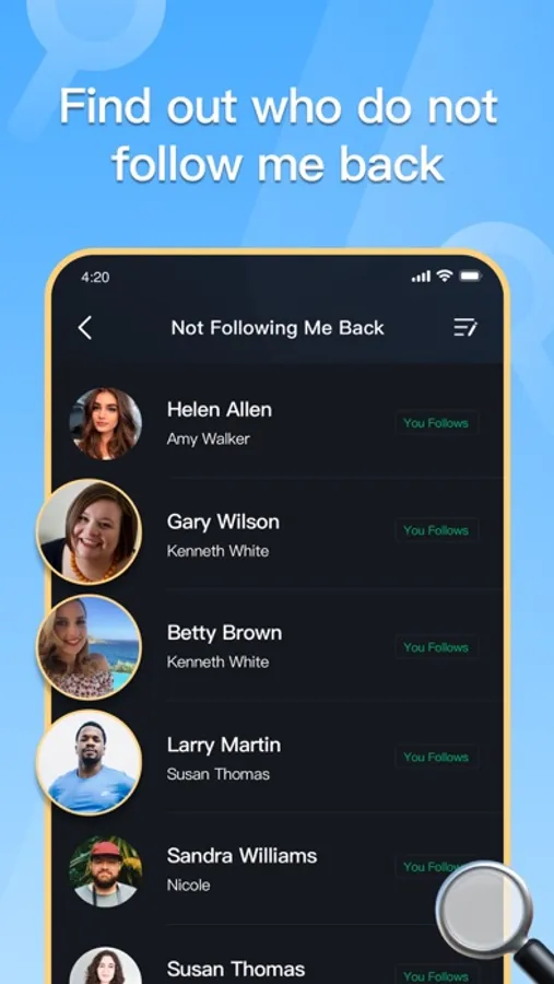 Find your followers, unfollowed people, unfollow users from mutual follow, identify users who have unliked , and more!