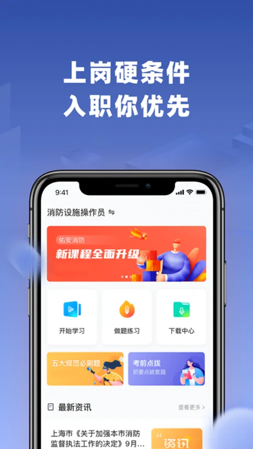 佑安消防App是为有消防安全职业技能学习需求的学员量身打造的学习辅助App。包含消防安全类实时考试资讯,课程学习、题库练习等辅助学习功能,帮助学员高效学习,轻松应对认证考试。