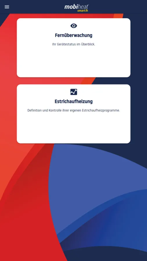 Die App verfügt über ein Hauptmenü. Dort können Sie zwischen den beiden Bereichen „Fernüberwachung“ und „Estrichaufheizung“ wählen.