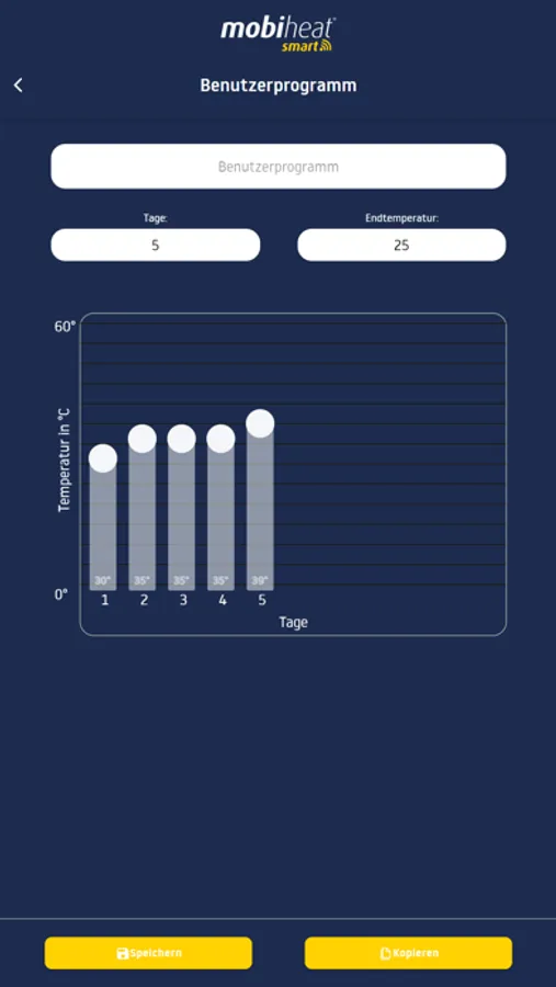 Um in der App ein neues Programm zur Estrichtrockung zu erstellen, müssen Sie zunächst die Anzahl der Tage, sowie die Endtemperatur eintragen. Für jeden eingetragenen Tag wird anschließend in der App ein Regler hinzugefügt. Dieser lässt sich manuell per Touch mit dem Finger auf die gewünschte Temperatur verstellen.