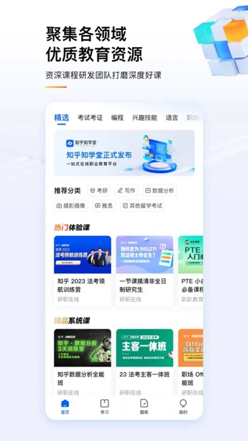 知乎知学堂全平台覆盖包括数据分析、零基础写作、编程、Office 办公等职场实用技能课程,以及提供考研、雅思、教资、CFA 等考试的一站式解决方案,另有海量精品公开课免费看。