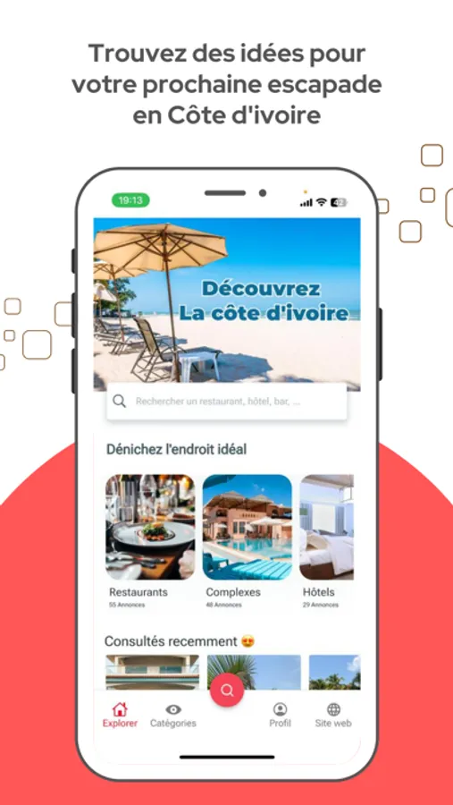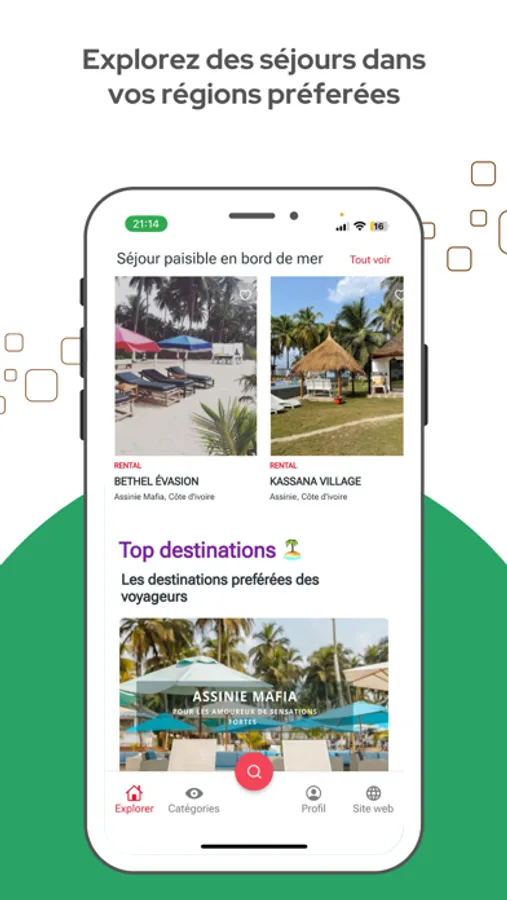 Téléchargez la première application de vacances en côte d'ivoire et rejoignez des milliers de personnes qui, comme vous recherchent des endroits chauds et tendances du pays pour séjourner. Trouvez l'hébergement ou le restaurant idéal pour vos vacances à Assinie, Grand Béréby, Yamoussoukro ou partout en côte d'ivoire.