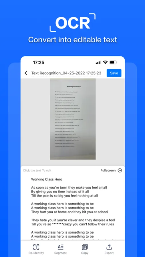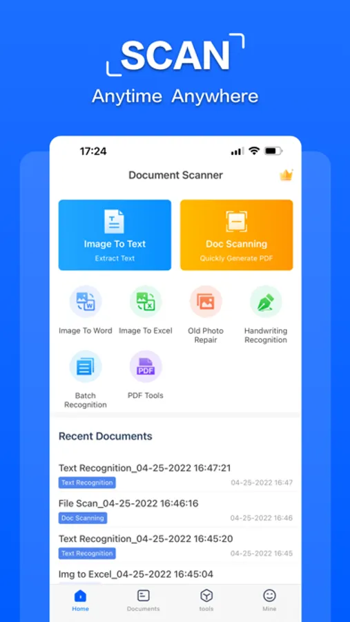 Document Scanner is a mobile phone scanner that integrates document scan, recognizes text automatically (OCR), PDF converter, handwriting to text, old photo restoration and ID Card & passport Scan. Download this scanner app for free to instantly scan, save, and share any document in PDF, JPG or TXT formats.