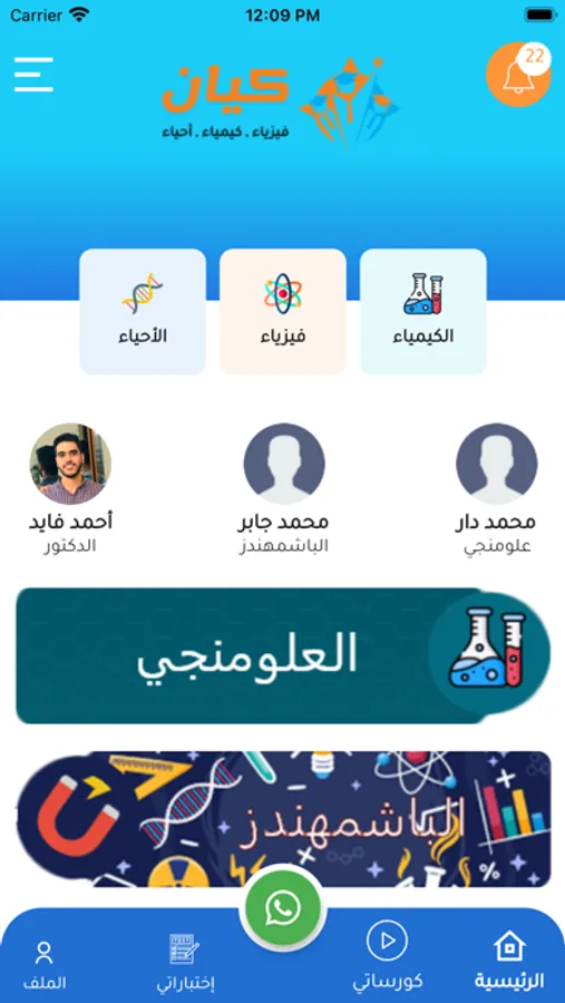 يضم التطبيق مدرسين في مواد الأحياء و الكيمياء و الفيزياء:
