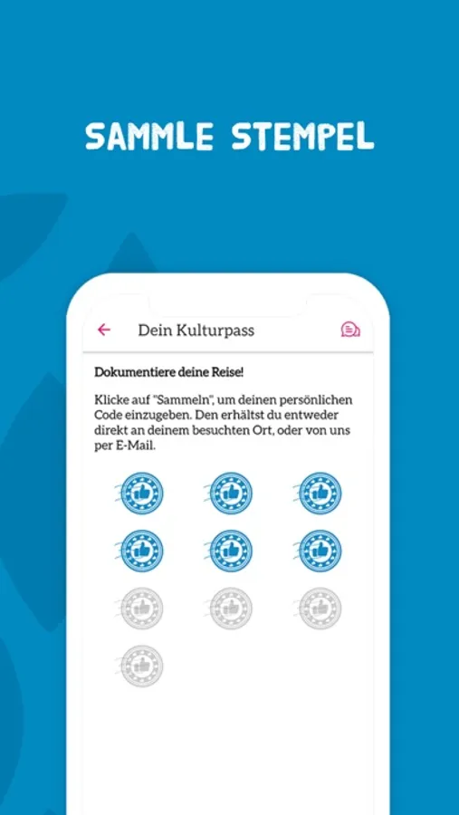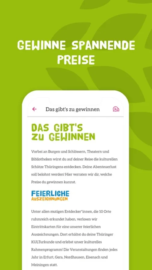 Hol dir den Thüringer Kulturpass auf dein Smartphone und starte dein Abenteuer noch heute! Auf deiner Reise wirst du viele spannende Kultureinrichtungen finden, die nur darauf warten, von dir mit dem Thüringer Kulturpass erforscht zu werden. Bei jedem Besuch eines Museums, Theaters oder eines anderen kulturelles Ereignisses kannst du einen von insgesamt 10 Stempeln sammeln und spannende Preise gewinnen! Beginne dein Abenteuer, hinterlasse deine Spuren und werde selbst zur Legende!