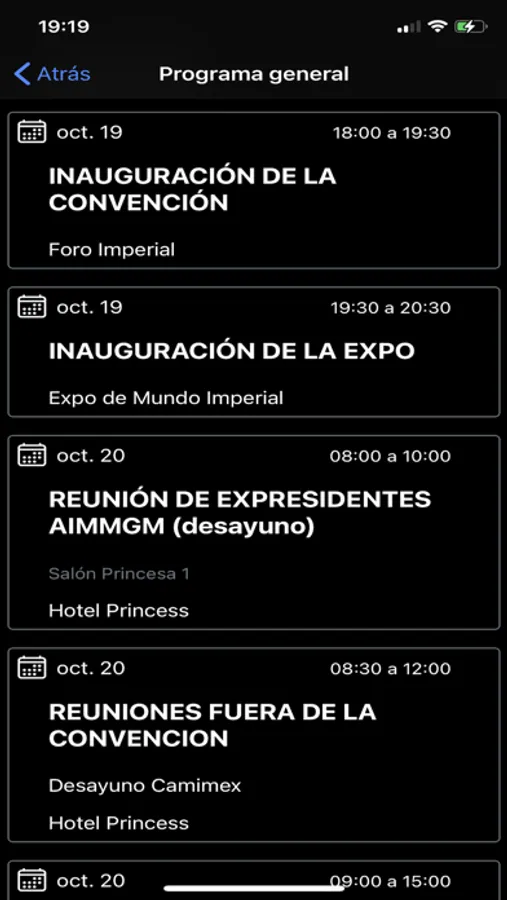 Programa del evento con fechas, horarios y salones de las conferencias.