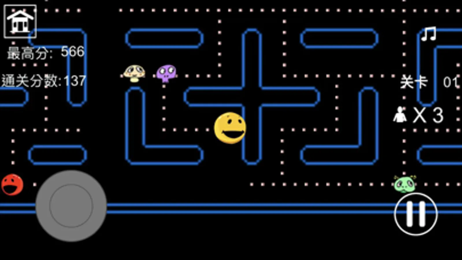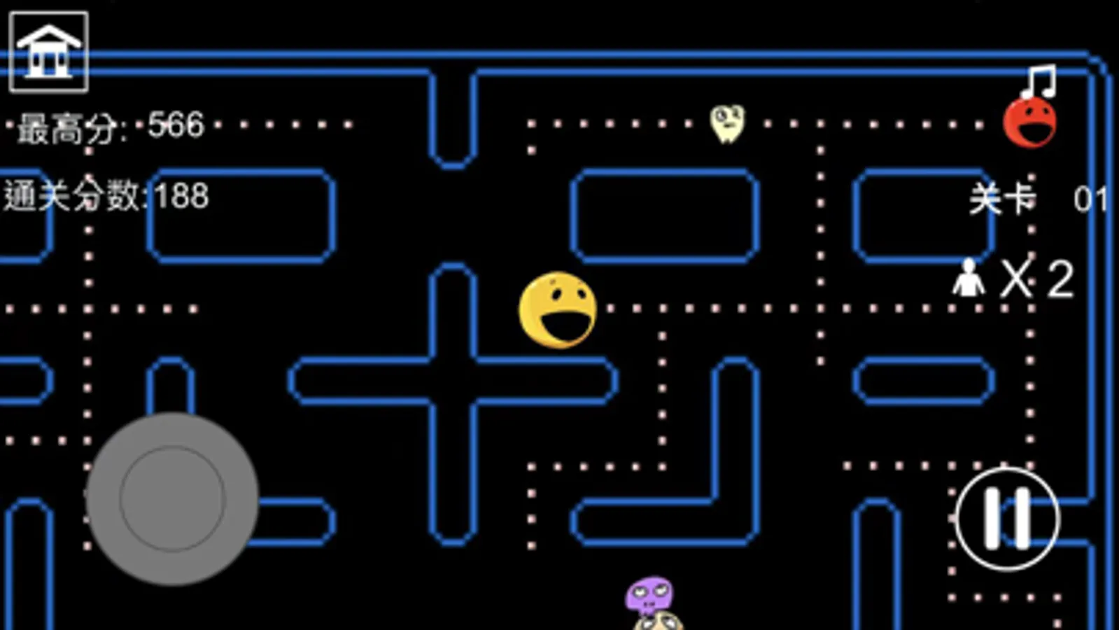 可以通过屏幕左下角的虚拟摇杆进行让方块人上下左右移动,游戏的目标是吃掉所有的能量豆,同时要注意不要被四处游荡的幽灵给抓住了哦,被被幽灵抓住时会丢失方块人的一条生命,当生命为0时则宣布游戏失败!