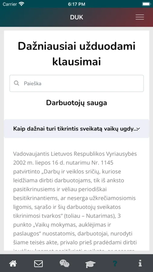 Šio projekto metu turi būti sukurti du informacinėmis technologijomis paremti įrankiai, skirti darbuotojų saugos, sveikatos ir darbo santykių teisės žinių pasitikrinimui. Sukurti įrankiai bus pagalba socialiai atsakingo verslo iniciatyvoms, prieinami plačiai auditorijai, pritaikyti tiek stacionariems, tiek mobiliems įrenginiams (patalpinti mobilių aplikacijų duomenų bazėse). Informacija apie įrankius bus paviešinta projekto renginių metu socialiniuose tinkluose ir projekto viešinimo veiklų metu. Pirmas įrankis apims DSS techninius klausimus: asmeninių apsaugos priemonių naudojimą, ženklinimą, reikalavimus įvairioms darbo vietoms ir pan. Antrasis įrankis bus skirtas darbo santykių klausimams: darbo laiko trukmės, darbo sutarties sąlygų, apmokėjimo už darbą ir pan. Abu įrankiai bus sukurti paprastai ir suprantamai, su nuorodomis į teisės aktus. Įrankiai padės pasitikrinti DSS bei DS žinias tiek įmonių darbuotojams, tiek vadovams, o tai prisidės prie DSS darbe kultūros formavimo, kuri, savo ruožtu, didins visuomenės netoleranciją socialiai neatsakingam verslui. Įrankiuose bus numatyta užklausos funkcija, kuri nustatyta tvarka leis užduoti klausimą Valstybinės darbo inspekcijos konsultantams bei/arba informuoti apie galimą pažeidimą, automatiškai nustatant pažeidimo vietą bei sudarant galimybę jį nufotografuoti.