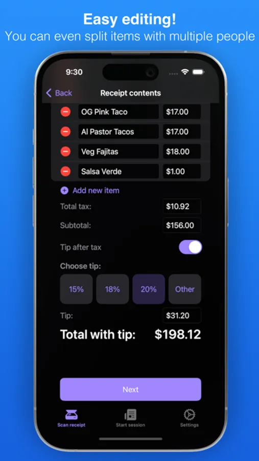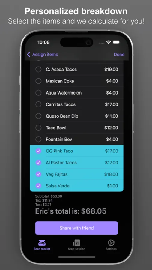 Do you hate putting an entire tab on your card, taking a picture of the receipt, and then calculating what everyone owes you? Then IOU is for you! This app will scan a receipt for you and itemize it. Then, you can add the people in your party and go one by one choosing what they ate/drank! The end result is a calculated total that includes tip and tax per person! No more having to do this manually and hoping everyone is paying you the correct amount.