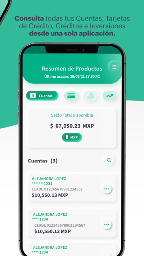 • Consulta de saldos de las cuentas, tarjetas de crédito, inversiones y créditos.