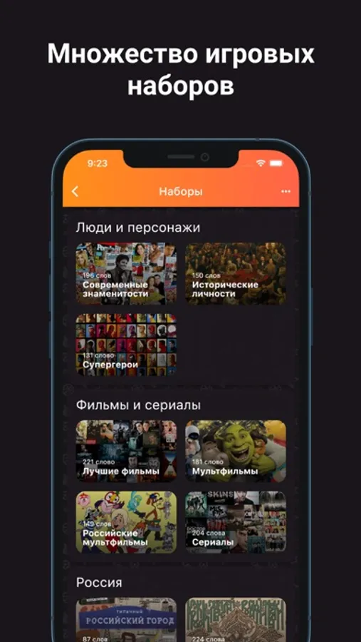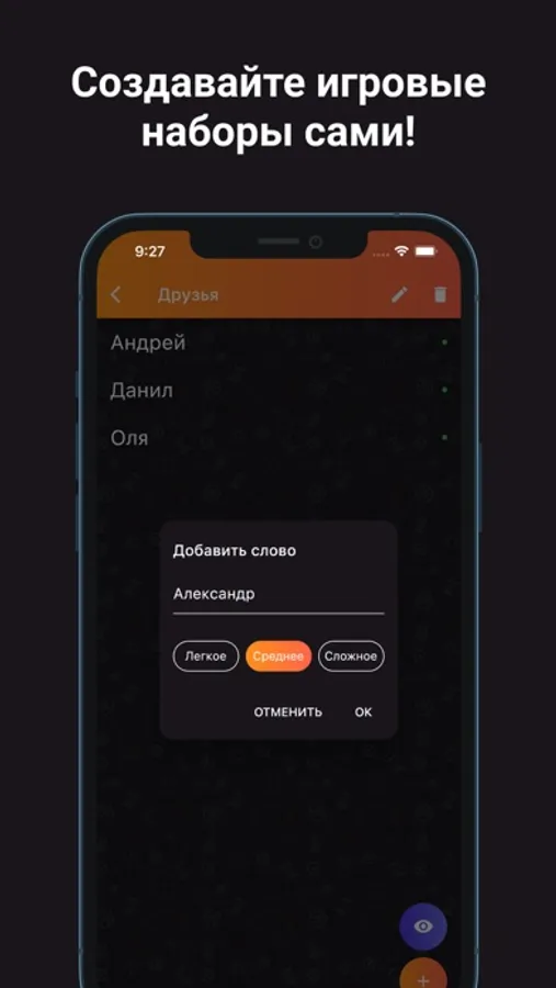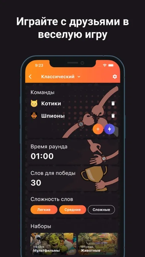 Делитесь на команды, выбирайте наборы слов и их сложность, установите порог слов для победы и время таймера, начинайте игру!